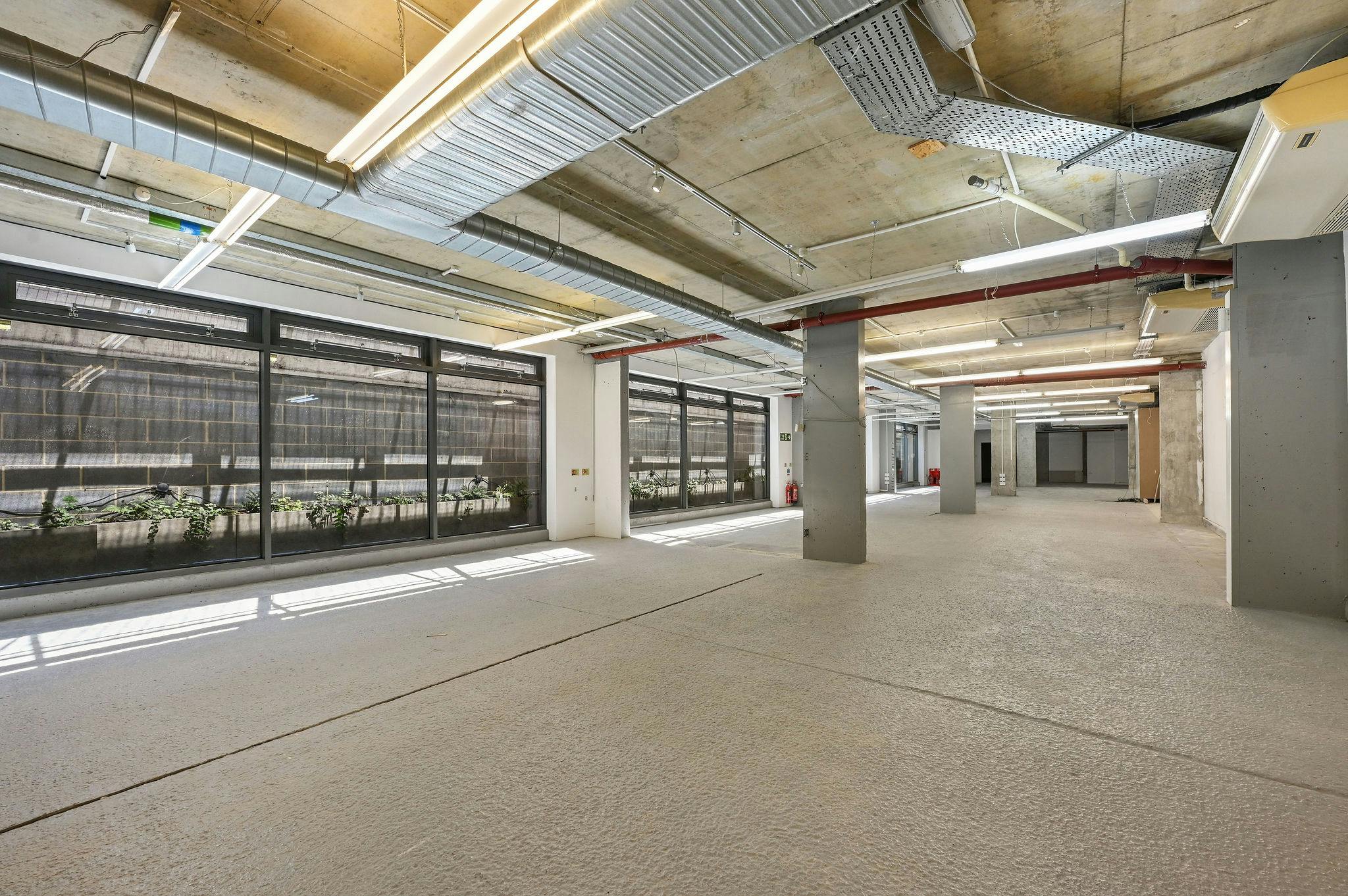 This lower ground commercial space in the heart of Hackney, provides an open plan industrial style commercial space that could suite a wide range of occupiers, from gym, office, showrooms, warehouse and many more. The space benefits from, a concrete floors and exposed concrete features through out, air conditioning, meeting rooms, floor to ceiling glazing and a private courtyard.